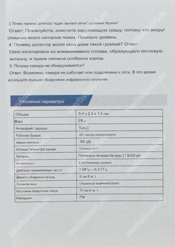 Режимы работы, поиска | 1) Электромагнитному излучению. 2) Магнитному полю. 3) Визуальный поиск скрытых микро видеокамер при ИК. 4) Фонарик. 5) Противоугонная сигнализация. |