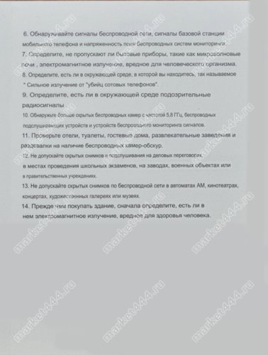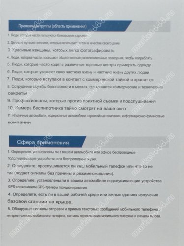 Частотный диапазон поиска 1МГц - 6500 МГц. Шпионская техника, которую обнаружит прибор в этом режиме: